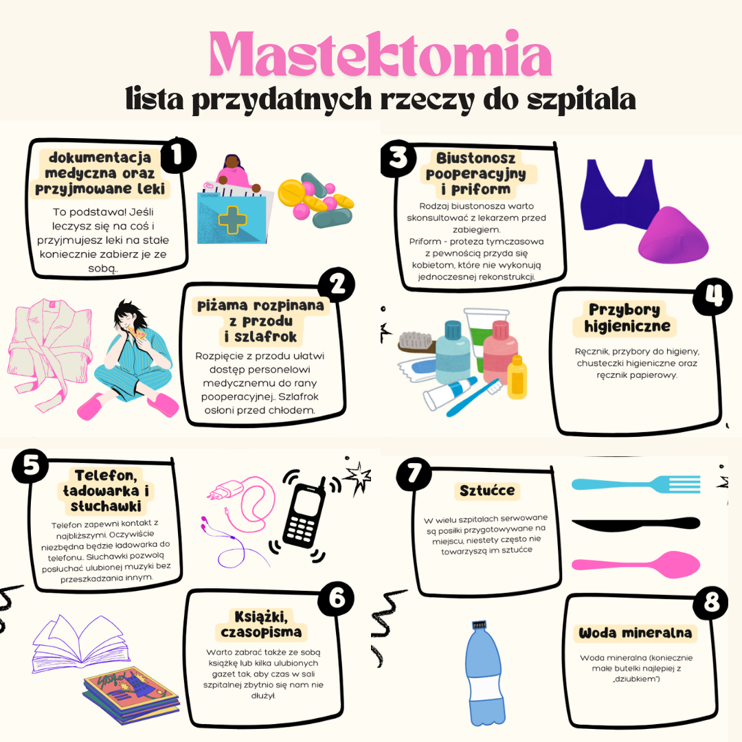 ✅Bielizna osobista - pacjentki, które idą do szpitala na operację rekonstrukcji piersi powinny mieć ze sobą gorset pooperacyjny i pas uciskowy. Są one niezbędne do uzyskania dobrego efektu wizualnego po zabiegu. Jeśli jest to zabieg mastektomii lub częściowej mastektomii warto mieć bawełniany biustonosz zapinany z przodu (pozbawiony wszelkich koronek, fiszbin etc)