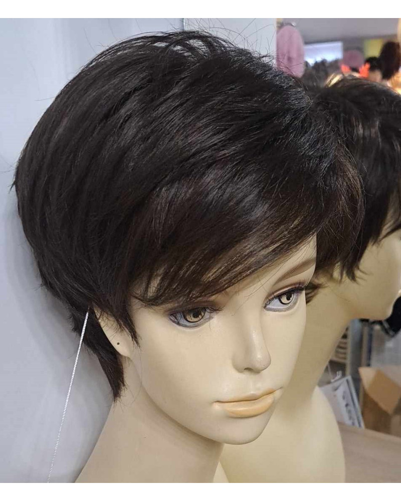 - Na przedziałku z lewej strony posiada mikroskórę, dzięki czemu wygląda naturalnie. Grzywka jest dłuższa z przodu co daje delikatną asymetrię.